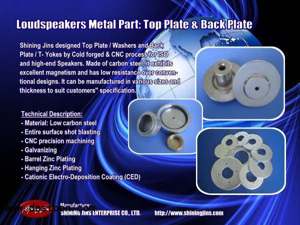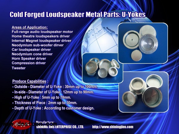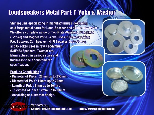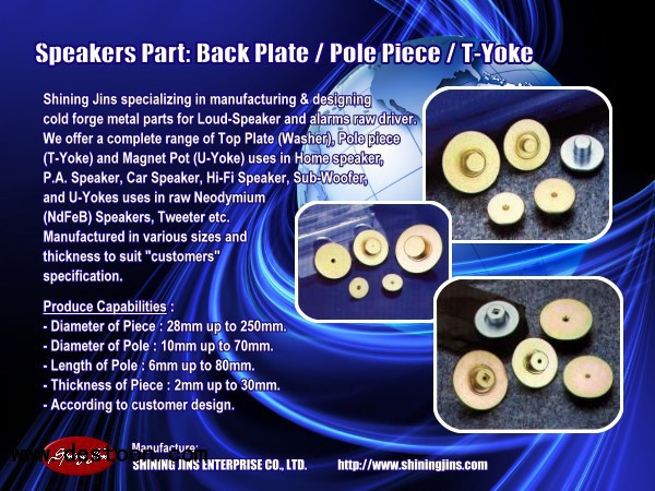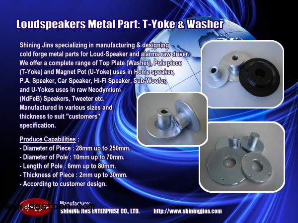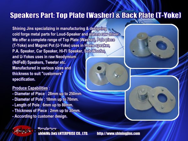 SHINING JINS ENTERPRISE specializing in manufacturing & designing cold forge Top Plate (Washer) and Pole piece (T-Yoke) for Loud-Speaker and alarms raw driver in Taiwan. We offer a complete range of Top Plate (Washer) and Pole piece (T-Yoke) uses in Home speaker, P.A. Speaker, Car speaker, Hi-Fi speaker, Sub-woofer,Car alarms and U-Yokes uses in raw Neodymium (NdFeB) speaker, tweeter etc.