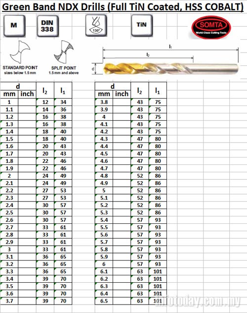 Green Band NDX Drills (FULL Tin Coated, HSS COBALT)