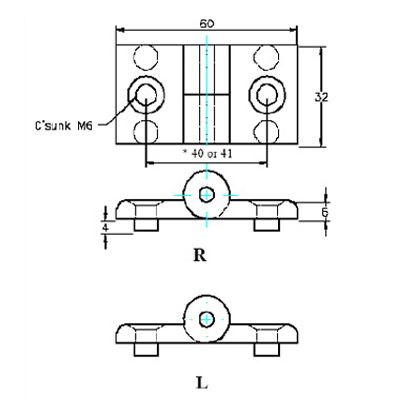 | Light Duty Hinge 40x40 profile Use for CP 4040-8 profile. Use with C’sunk screw M6x16 & Half Round Nut CP-HRN6-8. L for left side mounting, R for right side mounting. |