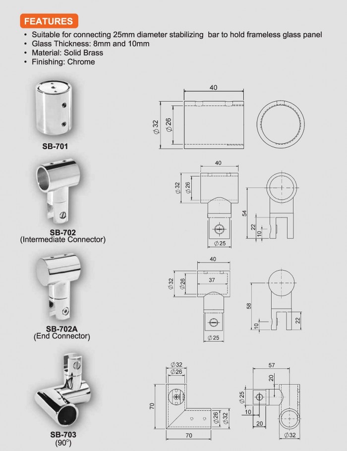 - Suitable for connecting 25mm diameter stabilizing bar to hold frameless glass pane