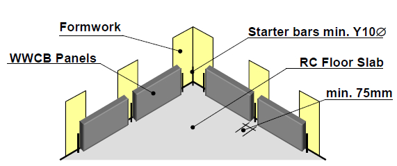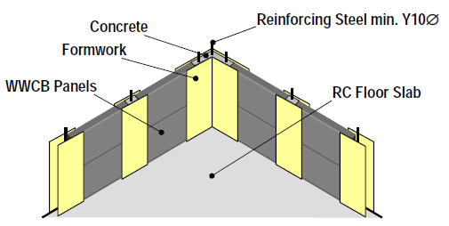 8. STACK THE WWCB UP TO RING BEAM HEIGHT AND INSTALL THE REINFORCING STEEL, TIED TO THE STARTER BARS. THE VOIDS ARE CLOSED WITH FORMWORK WHICH IS TIED THROUGH THE WWCB TO THE FORMWORK ON THE OPPOSITE SIDE AND THE VOIDS ARE FILLED WITH CONCRETE (GRADE 20) .