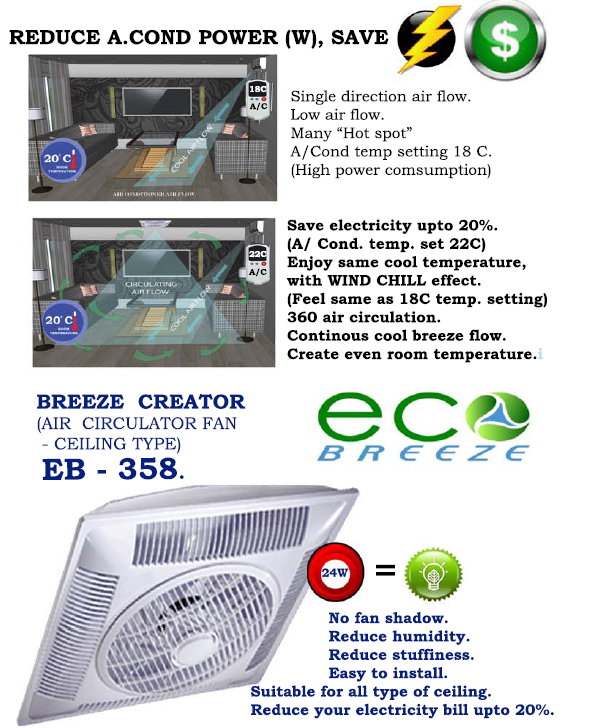 HOW ENERGY IS SAVE – Reduce Air Condition HP Size, reduce electric consumption and EcoMotor only 27W. Breeze Creator is equipped with all the necessary safety features to ensure safety usage in all environment.Thermal cut off fuse, Double isolated product & Safety current fuse.