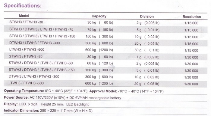 • Up to 1/ 30,000 display resolution • Faster weighing stability • Faster zero return; Very short residual after weight is removed • Zero and Tare keys react faster • LCD display (weight-6 digits); Full range tare; Auto zero tracking; Pre-tare Preset weight or quantity; weight accumulation • Simple counting; Gross/Net indication; Hold Function; Check Mode Lo/Hi/OK • Auto Calibration function, OL protection • Weight and quantity over-limit warning • Pre-tare function • Kilogram (kg), pound (lb) weighing modes • Stable sampling range setting function • Built-in rechargeable battery • Temperature compensation available for non-approval model to be more accurate and stabler