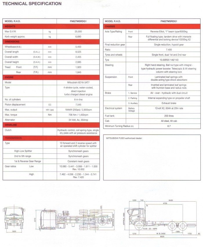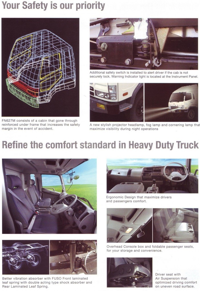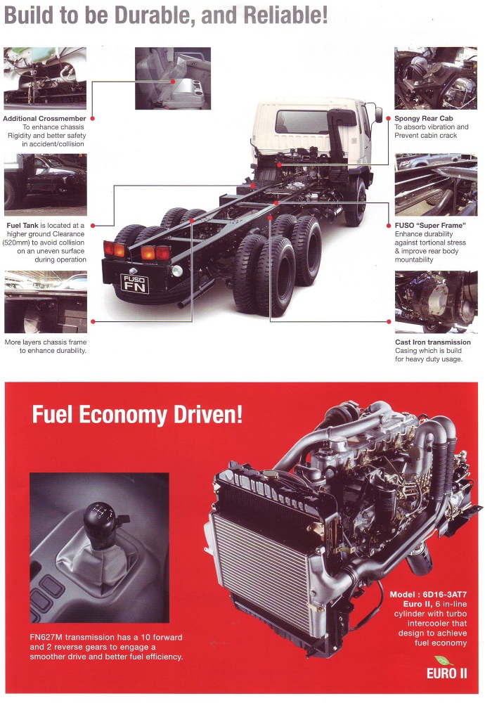 The Mitsubishi FUSO FN series 10-wheeler truck for heavy duty features superior power and efficiency. The perfect combination of strength and power of the Mitsubishi FUSO FN series create reliability while incorporate with Euro II emission standard that boost the eco-friendly function of a heavy duty truck. It comes with super frame structure that can support heavy duty due to special high tensile steel.