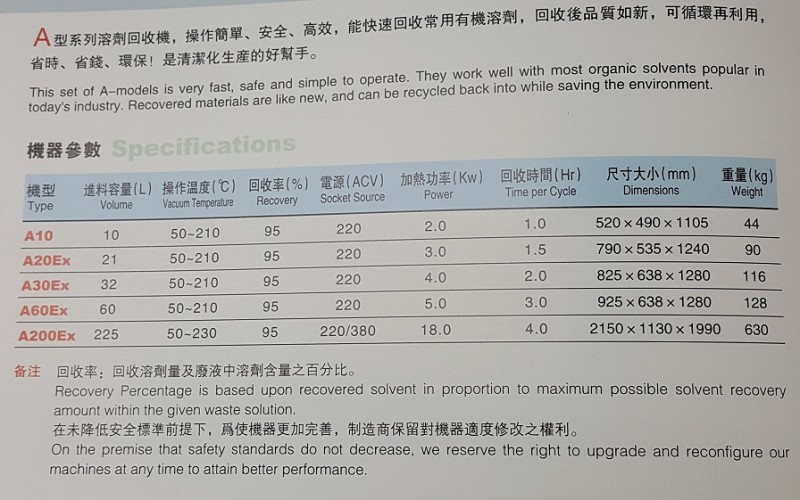 NOTE: Values listed above, the recovery time is under ideal conditions in laboratory test values during recovery of toluene for reference. The actual operation in the process of recovery and the waste solution inside the impurity content, high and low boiling point solvents, environmental temperature, viscosity, etc. differ.