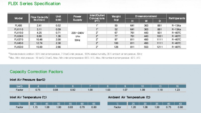 The FLEX series are optimized air dryers for hot and humid climate in the tropical regions. An advanced stainless steel brazed plate heat exchanger is applied, and it deters refrigeration load with great efficiency of heat-transfer. The innovative and simplified refrigeration circuit provides reliable operation, low operating cost and versatile installation.