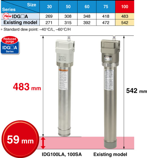 Membrane air dryer series IDG is available in a single unit or combination unit style. IDG/M models combine a mist separator and micro mist separator with a single unit. IDG/V models combine a regulator with the IDG/M model. Options available include one-touch fitting exhaust of purge air. If purged air is not exhausted around membrane air dryer, air is exhausted with tubing away from its dryer.