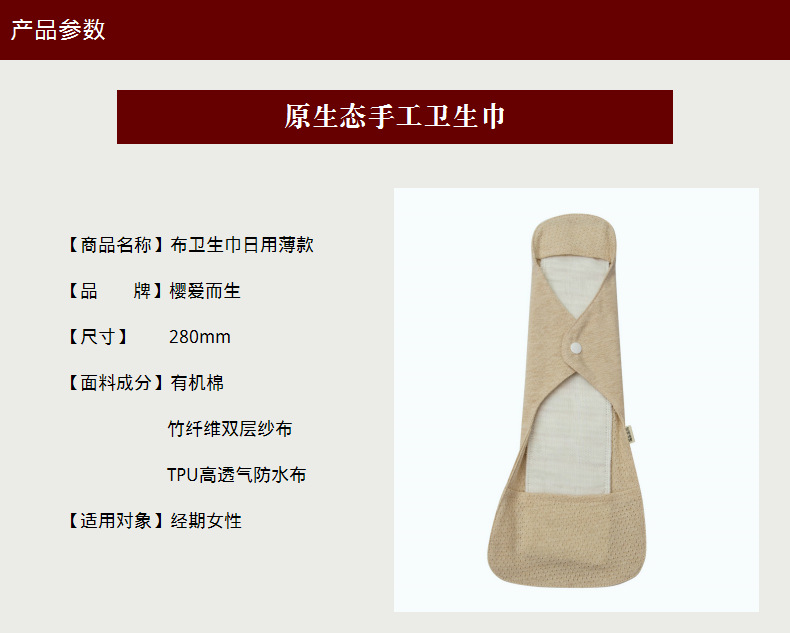 有机彩棉可水洗卫生巾 有防水层日用卫生巾280mm柔软透气 防过敏
