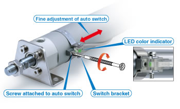 Fine adjustment of the auto switch set position can be performed by loosening the auto switch attached screw. Operability improved compared with the conventional auto switch set position adjustment, where the complete switch mounting band requires loosening.